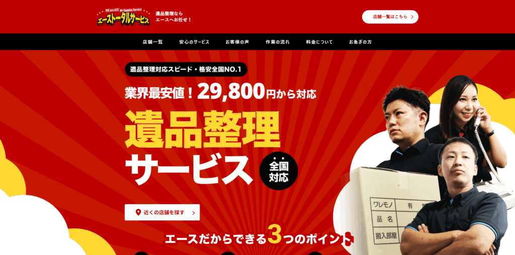 エーストータルサービスは、業界最安値の「29,800円」から対応可能な遺品整理業者です。不用品回収も可能なため、まとめての処分・整理に最適です。また、2階までの階段料金は無料になるため、2階建て自宅の遺品回収も低価格で対応してもらえます。