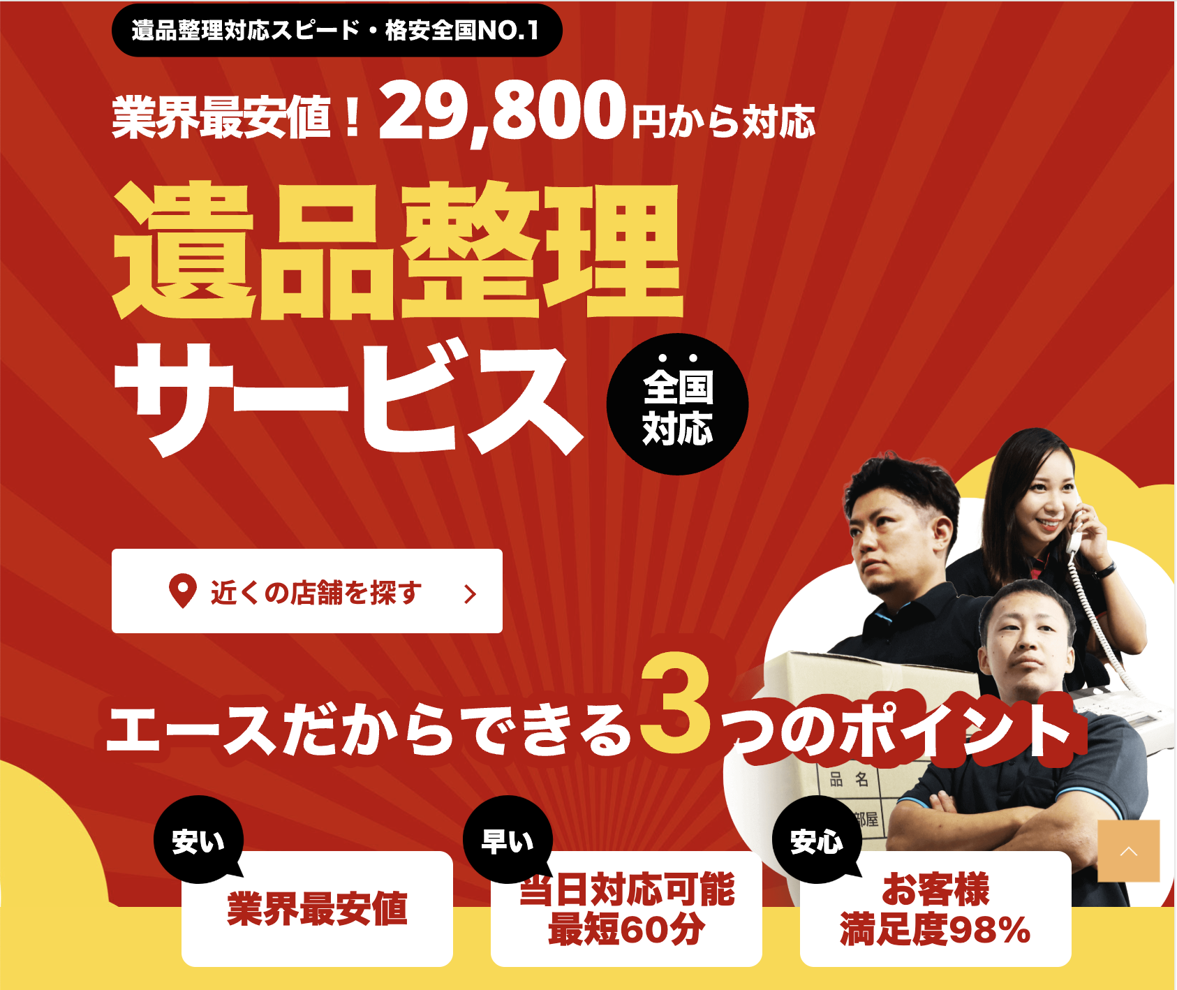 エーストータルサービスは、大阪にある遺品整理業者です。年中無休で当日最短60分から対応可能で、業界最安値の29,800円より遺品整理を依頼できます。