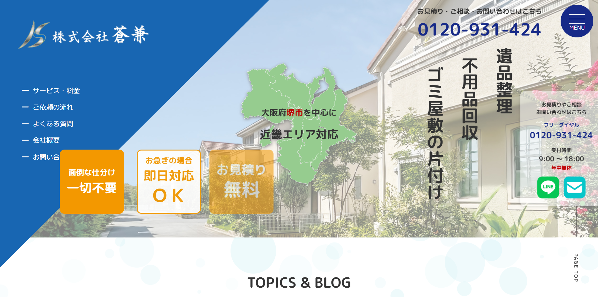 株式会社蒼兼は大阪府堺市を拠点に近畿エリアで遺品整理・不用品回収・ゴミ屋敷清掃・特殊清掃をしている専門業者です。産業廃棄物収集運搬業や古物商許可などを取得しており、正規の許可業者として安心して依頼できます。