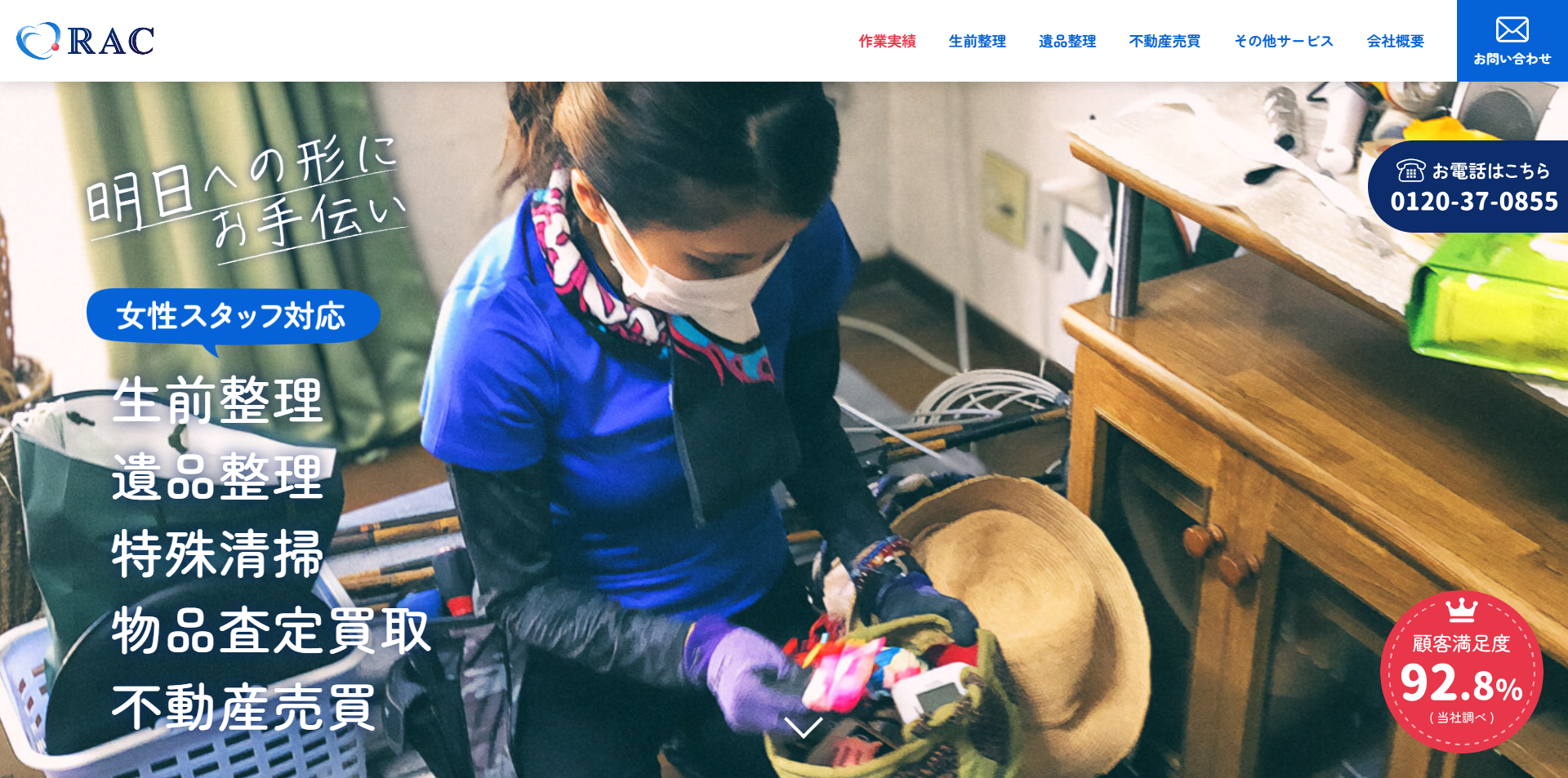 RACは大阪堺市を拠点に関西全域で遺品整理や生前整理をしている専門業者です。女性スタッフが中心となって作業を担当するため、デリケートな作業でも安心して依頼できます。遺品整理士の資格保持者が対応し、優良事業所認定を受けていることから信頼性も高い業者です。