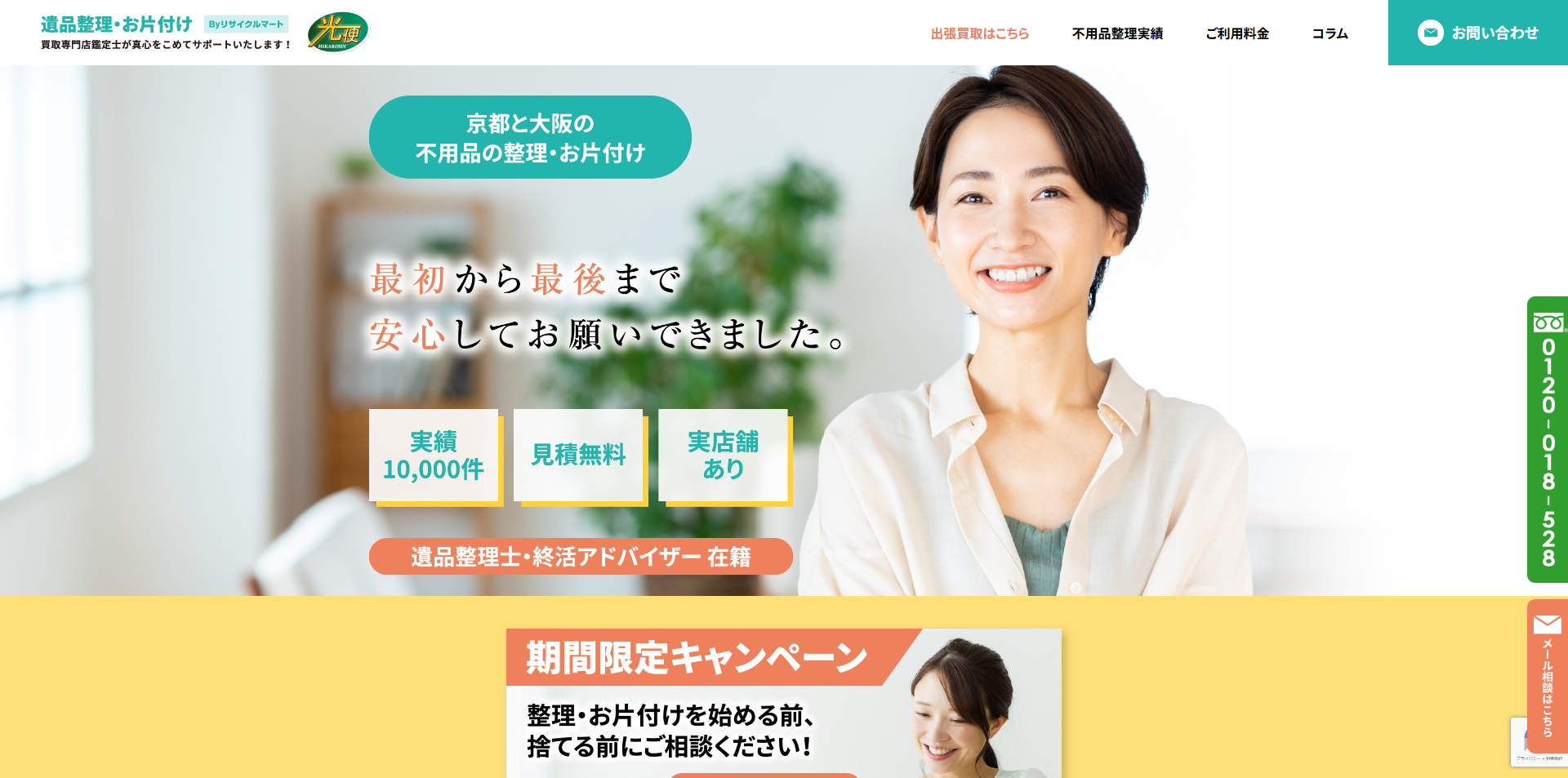 光便は、京都・大阪を中心に店舗を構える出張型の遺品整理業者です。不用品整理から遺品整理、ゴミ屋敷片付け、さらには出張買取まで幅広く対応しています。実店舗があるため信頼性が高く、追加費用が発生しない点も安心です。