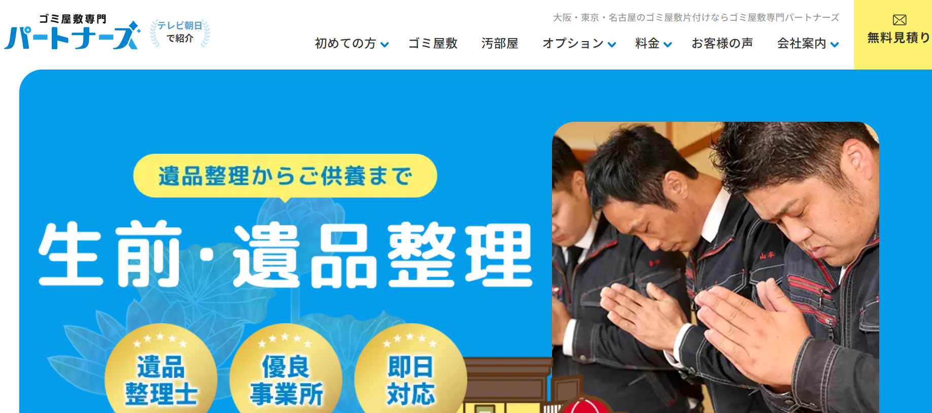 パートナーズは、年間3,000件以上の実績を持つ信頼できる遺品整理業者です。遺品の仕分けや貴重品の探索・搬出・簡易清掃・不用品処分まで一括で対応し、依頼者に追加料金の負担をかけません。